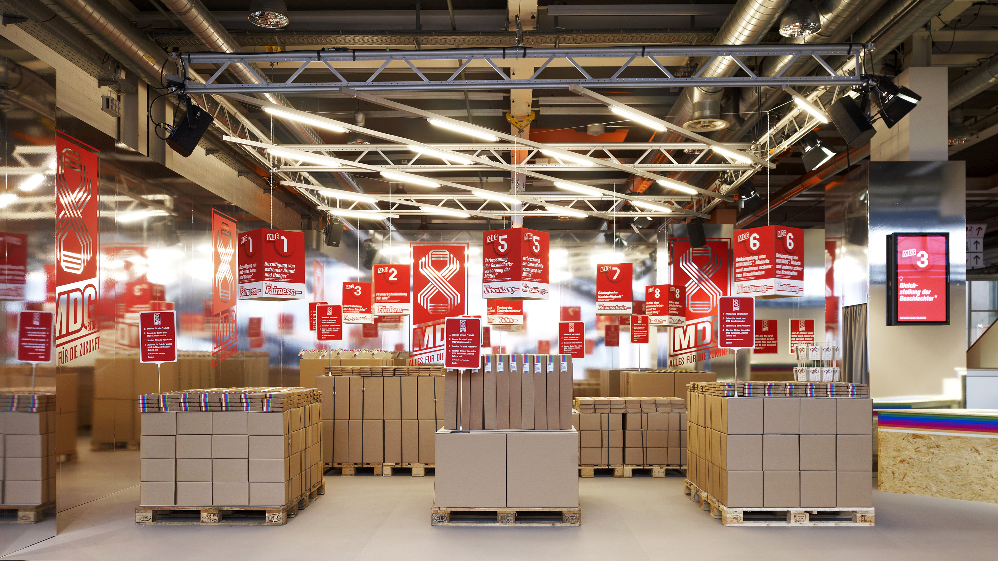 Die Szenografie des Standes erinnerte an einen Discounter. Und diente als «Bühne», um den Besucher*innen eigens für diesen Auftritt entwickelte Produkte übereichen zu können, die an die acht Milleniumsziele erinnerten. Ein spielerischer Ansatz, das übergeordnete Ziel – die globale Zukunftssicherung – im Alltag stets selbst vor Augen zu halten und sich für Themen wie Armutsbekämpfung, den Schutz der Umwelt oder die Menschenrechte einzusetzen.